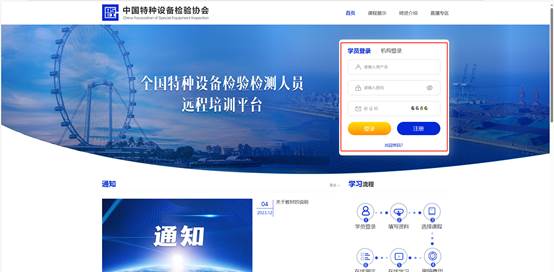 首页登录注册,可进行个人及机构不同身份登录。同时附带通知公告内容及学习流程。